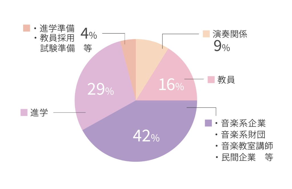 かつて音楽大学生の就職先は、オーケストラや合唱団などの演奏団体、教員や音楽教室講師などが主なものでした。しかし、最近では音楽マーケットの拡大により、さまざまな企業がアートマネジメントスキルをはじめ、音楽的素養を持つ人材を求めており、本学卒業生の活躍するフィールドが大きく広がっています。また、卒業後、演奏家を目指すために大学院や留学先にて研鑽を積む学生も多くいます。