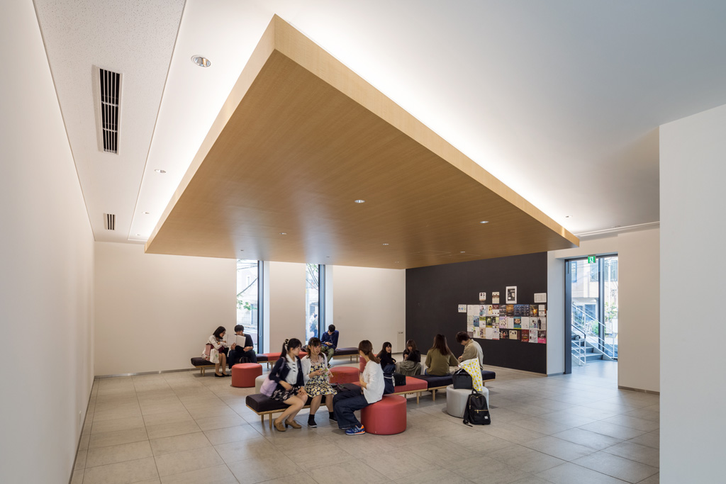 校舎最上階のS棟5階には展望ラウンジ”Bis”を設け、学生同士や学生と教職員の語らいの場となっています。ここからは東に東京スカイツリー、南に新宿副都心、西に富士山を望む一大パノラマを楽しむことができます。また、展望ラウンジに接したエレベーターホールは、ラウンジと外部のテラスとの一体的な利用が可能であり、レセプションやパーティーなどに活用されます。