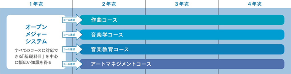 本学科は、作曲・音楽学・音楽教育・アートマネジメントの4つのコースで構成されていますが、まず1年次において4つのコースの基礎的内容を総合的・横断的に学ぶことができます。その間に自分の進みたい方向や適性を見極め、2年次からコースを選択して専門的な学修に取り組んでいきます。この学びのかたちを「オープンメジャーシステム」と呼びます。ただし、1年次から専門的な学修に取り組みたいという場合には、1年次から希望するコースを選択することも可能です。これが「フィックスメジャーシステム」です。
