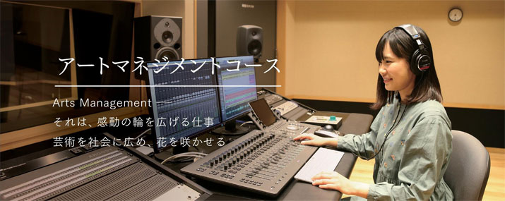 アートマネジメントコースは、音楽芸術の力によって心豊かな活力ある社会を形成していくための、芸術的感性とマネジメント能力を修得させるコースです。音楽に関する専門的知識と音楽実技の基礎に加え、舞台技術を含む劇場・ホール等に関する事項、演劇・舞踊等の舞台芸術、美術、文化政策や芸術関係の法制、財務のほか、コンピュータによる音楽制作、グラフィックデザイン、文書作成等について学修します。また、学内外における各種の実習を通して現場体験を積ませ、高い芸術的感性と優れたマネジメント能力を養い、音楽をはじめとする各種舞台芸術や音楽文化産業を牽引し、文化芸術活動に貢献できる人材の育成を目的とします。