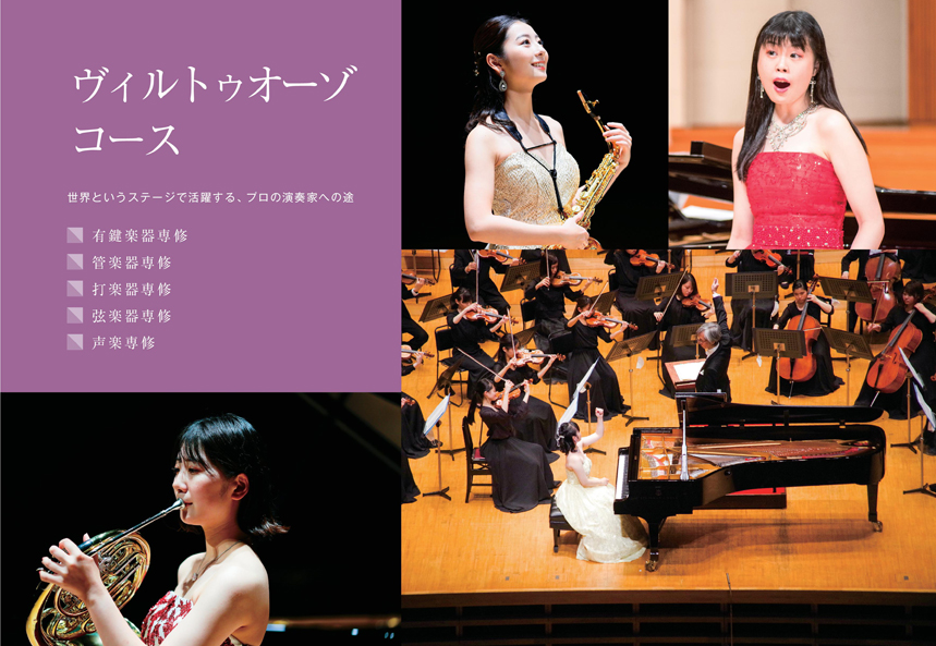 「ヴィルトゥオーゾ」とは、「音楽の名手」、「芸術(音楽)の技術に優れた人」を意味するイタリア語で、その名の通り、器楽または声楽の実技教育に重点を置き、プロの演奏家を育てるためのコースです。