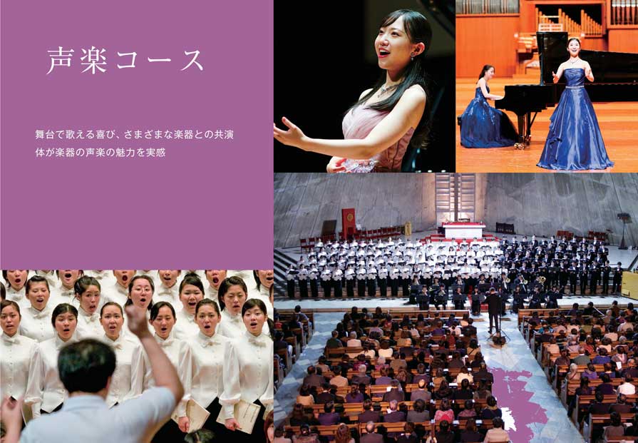 声楽コースは、実技個人レッスンにおいて、発声法等歌唱の基礎を修得し、これを発展させるコースです。古典から近現代にいたる声楽曲の、それぞれの様式に沿った歌唱法、また歌詞の理解と正確な発音に必要な語学力を修得し、独唱のみならず重唱・合唱・オペラ等の授業を通してアンサンブル能力の向上を図ります。さらに、公開試験やさまざまな形態の演奏会等、学修の成果を発表する機会を多く設けて、実践的な経験を積ませることで、豊かな表現力を身につけさせ、声楽家、合唱団員、指導者として文化芸術活動に貢献できる人材の育成を目的とします。