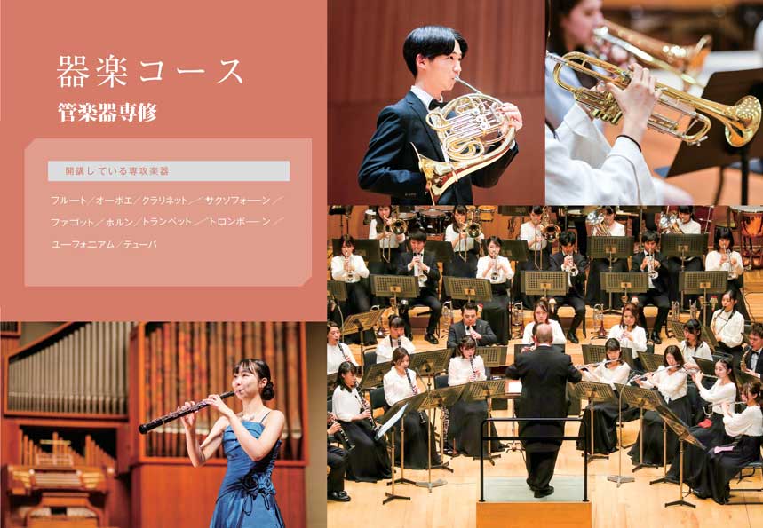 国内外のオーケストラ等で豊かな経験を持つ指導者や、現役の一流プレーヤーがレッスンを担当します。器楽コースの学修の基本となるソロレッスンに加えて、管楽器専修では管弦楽やウィンドアンサンブル(吹奏楽)、管楽合奏などの合奏授業を充実させており、それらの発表の機会として学内外のホールで演奏会を行っています。特に管弦楽団やウィンドアンサンブルは、国内外への演奏旅行、レコーディングなども積極的に行い、常に高い評価を得ています。