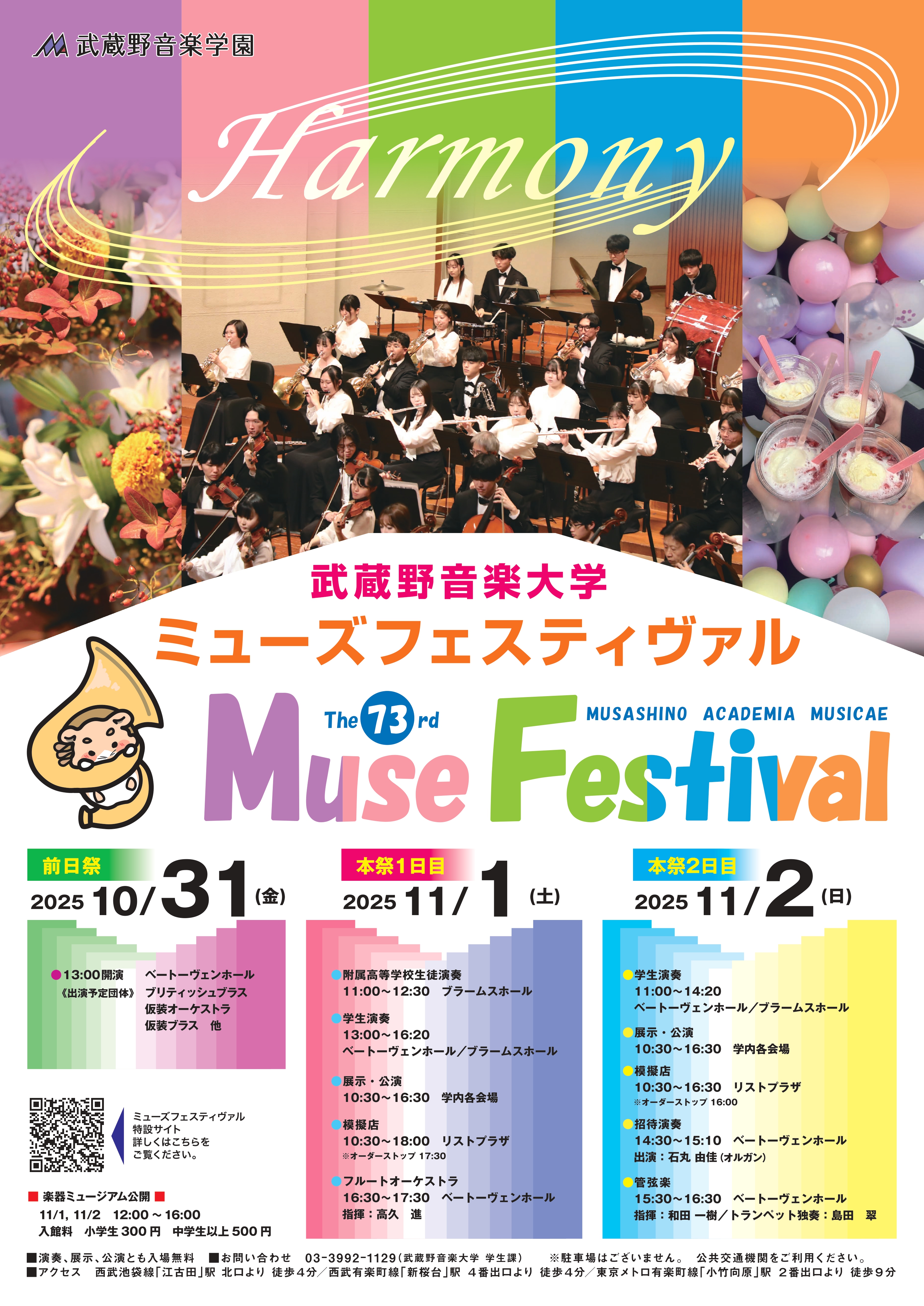 実施内容・会場等の詳細については、武蔵野音楽大学「学友会Webサイト」>Muse Festival 特設サイト をご覧ください。