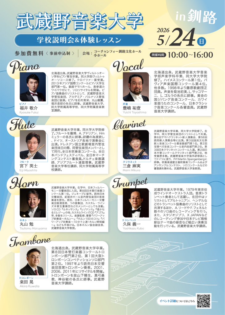 12:00~13:00 ガイダンス、ミニコンサート[ホルン独奏:丸山 勉/伴奏:福井 敬介]