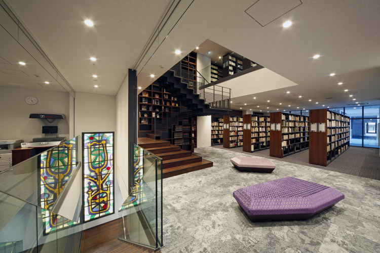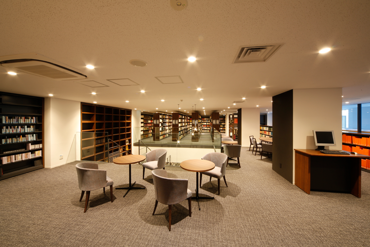中央に吹き抜けのある開放的な空間で、音楽書エリア、ブラウジングエリア(雑誌・新聞)、メインカウンターがあります。メインカウンターでは、貸出・返却のほか、資料の探し方や学修・研究に関するサポートも行っています。