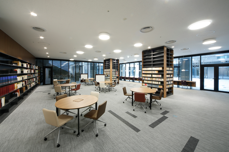 学生同士で自由に話し合いながら学修ができるエリアです。可動式のテーブルや椅子、ホワイトボードがあり、グループ学修、論文・レポート作成、プレゼンテーションの準備など、多様なスタイルの学修ができます。グループ学修用のアクティブルームが 3 室あり、電子黒板、AV 機器などが設置されています。