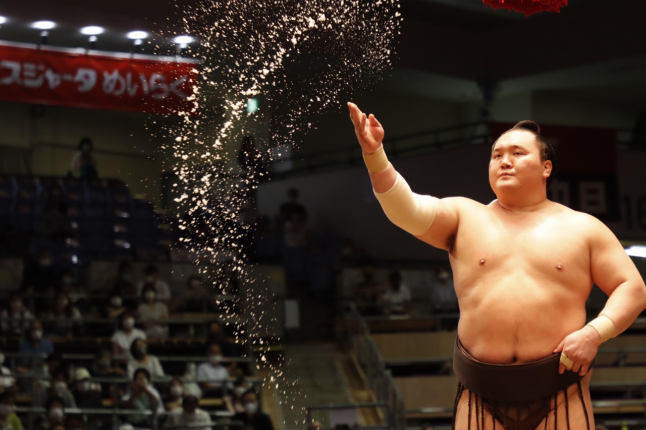 進退を賭けた場所で塩撒きをする白鵬関。全勝による奇跡の復活で45回目の優勝を決め、現役最後の場所を飾った(2021年7月14日ドルフィンズアリーナ)