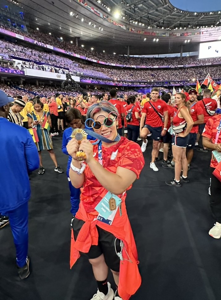 日本選手団最後の大会通算20個目となる金メダルを持って閉会式で(2024年8月11日)