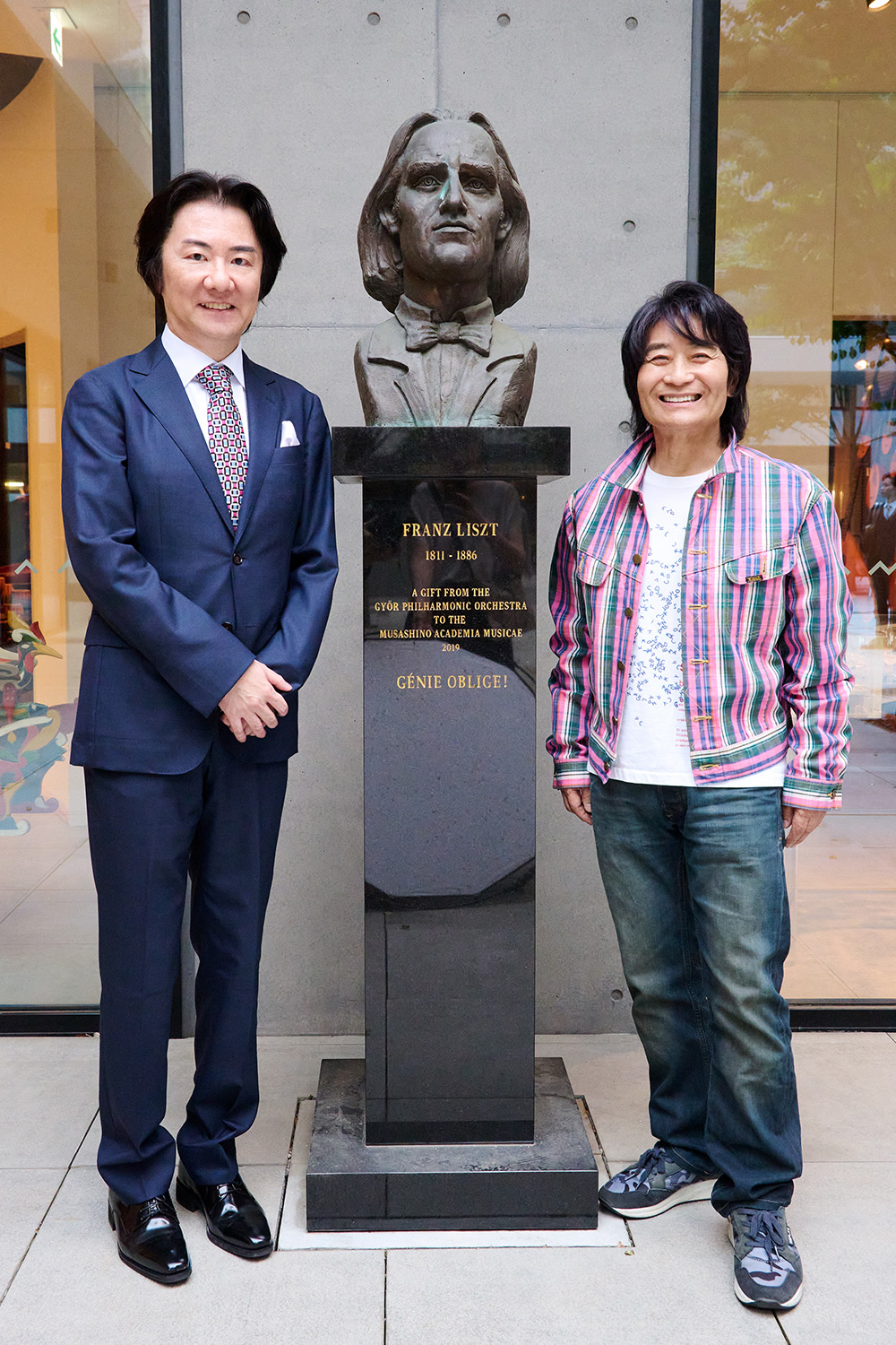 本学キャンパスのリストプラザに設置された「フランツ・リスト像」の前で