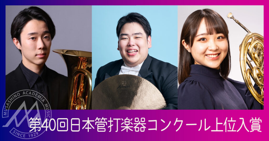 2025年8月に開催された「第40回日本管打楽器コンクール」にて、中村友亮さん(学部4年)がパーカッション部門にて第1位および全部門特別大賞・内閣総理大臣賞、杉田優希さん(2024年卒業)がユーフォニアム部門にて第2位、白井有琳さん(2021年卒業)がホルン部門にて第3位を受賞されました。