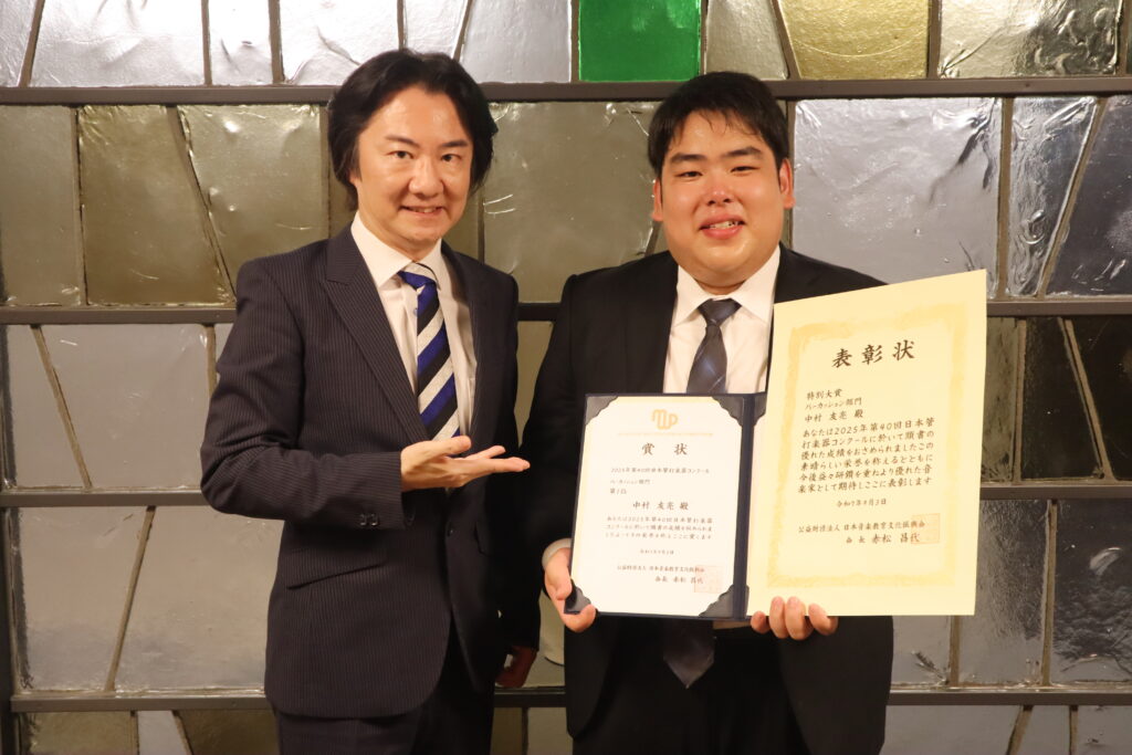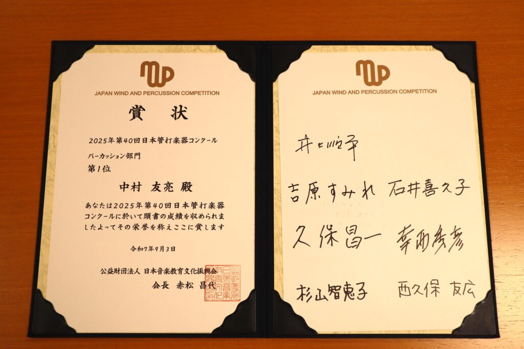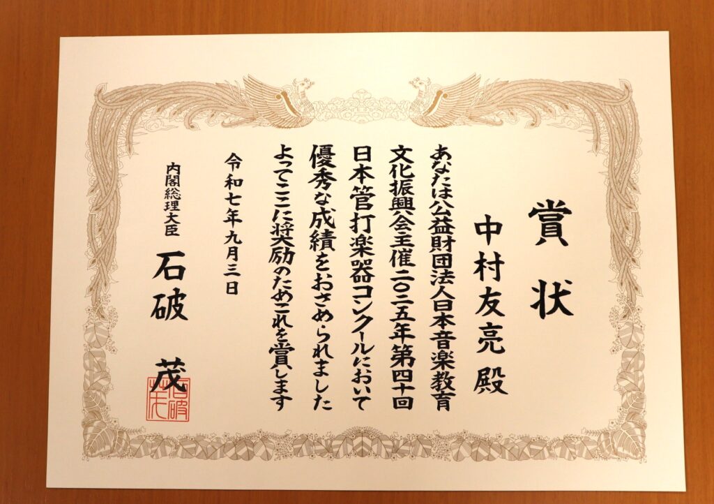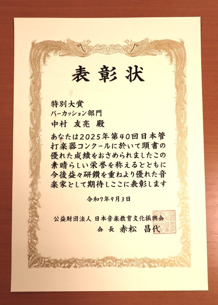 この度、第40回日本管打楽器コンクール・パーカッション部門にて第1位ならびに全部門特別大賞・内閣総理大臣賞を受賞いたしました。