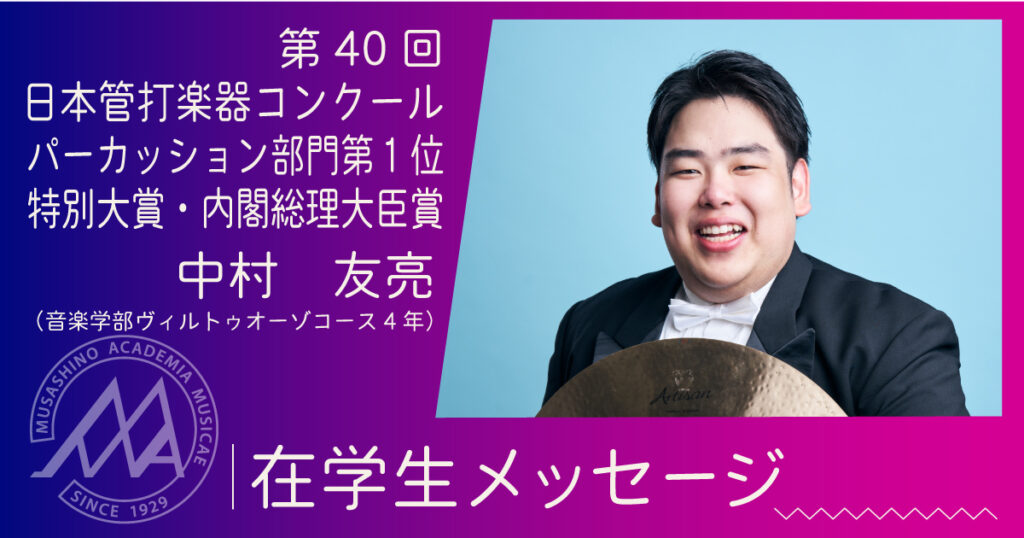 「第40回日本管打楽器コンクール パーカッション部門」にて第1位及び特別大賞・内閣総理大臣賞を受賞した中村友亮さん(学部4年)よりメッセージ