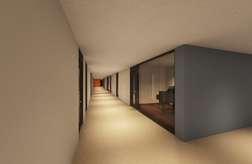 3階にはレッスン・練習室を32 室計画しています。壁面の一部をガラスとすることで、オープンな練習風景が連なります。このほかにも1 階に多目的スタジオを設けており、室内楽や打楽器の演奏に使用します。