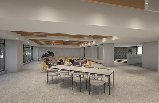 生徒が食事や歓談をするラウンジエリアです。大きなガラス開口から自然光を取り入れた明るい空間で、独創的な壁面のアートが視覚的な刺激にもなり、生徒の自由なコミュニティ形成を促します。